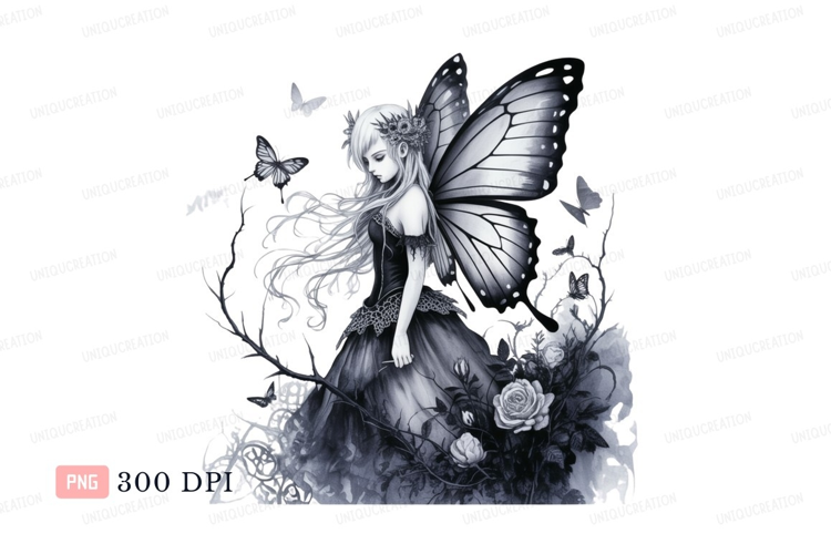 Black white fairy butterfly floral clipart P N G fantasy example image 1