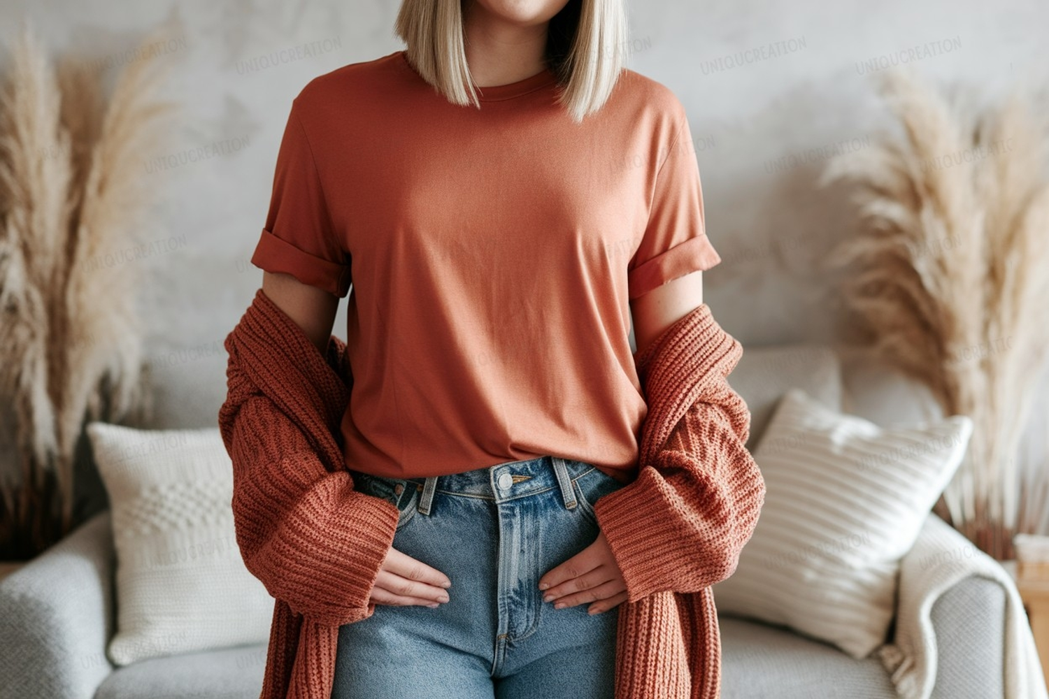 Terracotta tee denim jeans cozy cardigan mockup apparel example image 1