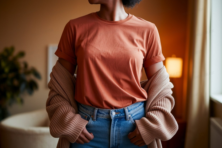Fashion Clothing Casual Mockup Tee Jeans Person Denim Cardigan Terracotta