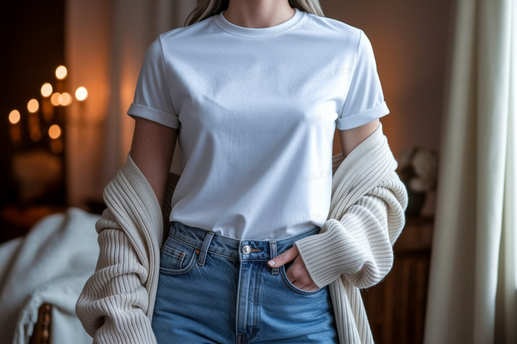 Similar Design Products to Woman wearing white t shirt and blue jeans mockup