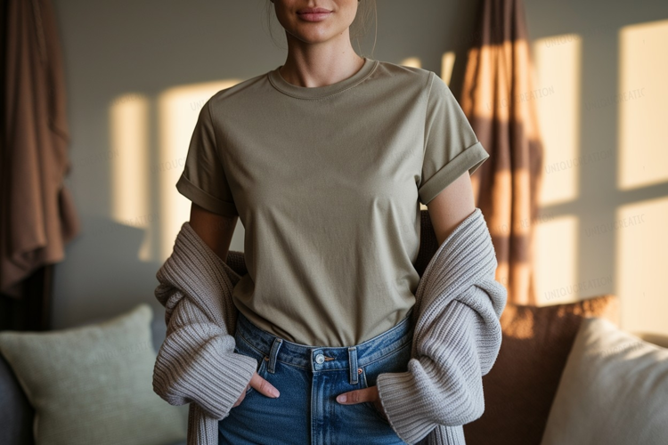 Similar Design Products to Woman wearing olive green t shirt and blue jeans image