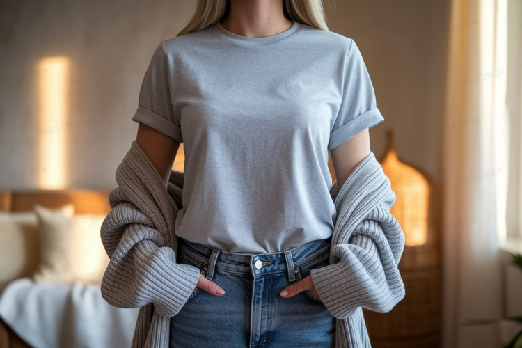 Fashion Shirt Clothing Casual Mockup Woman Jeans Grey T Indoor