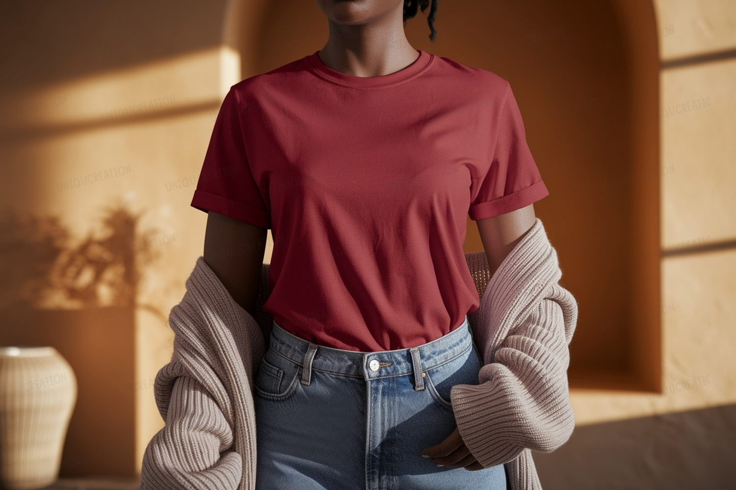 Fashion Shirt Clothing Casual Mockup Apparel Woman Jeans Red Outfit