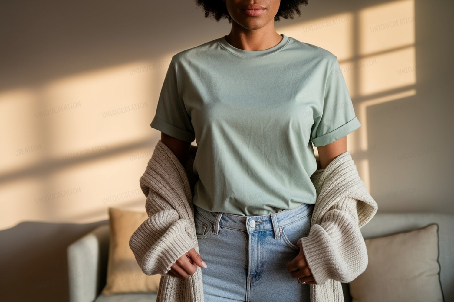 Similar Design Products to Woman wearing green t shirt and denim jeans
