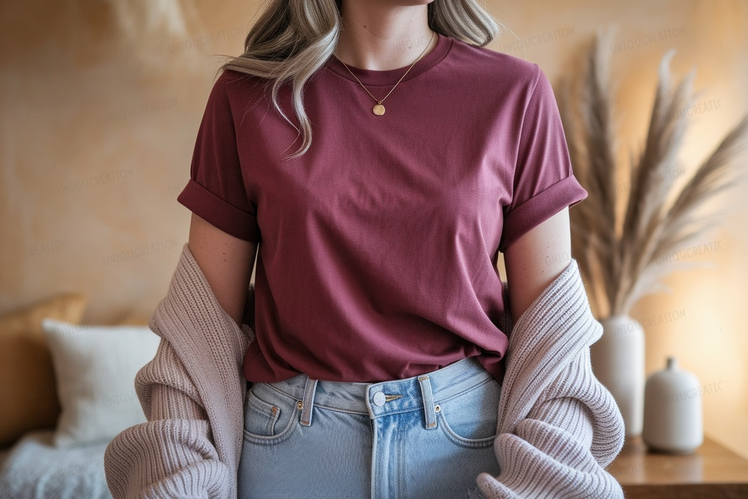 Fashion Shirt Casual Mockup Woman Jeans Necklace T Sweater Maroon