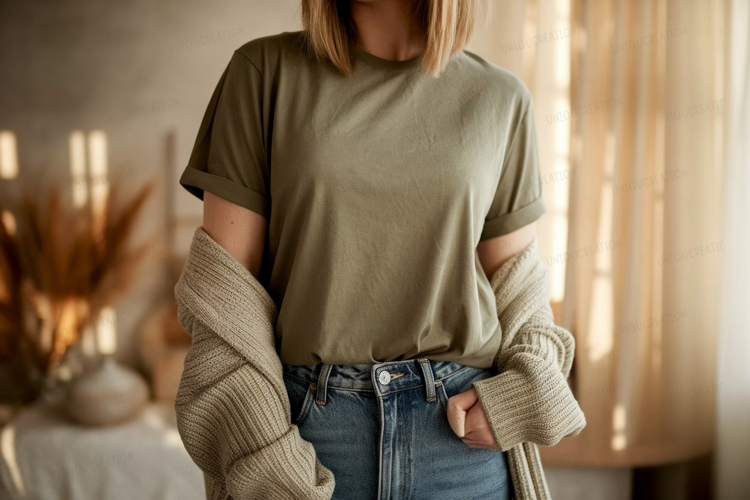 Similar Design Products to Olive green t shirt and denim jeans mockup image