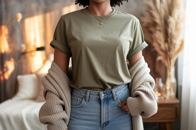 Similar Design Products to Olive green t shirt and denim jeans mockup image