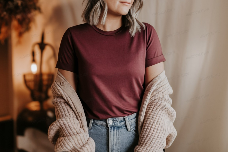 Fashion Shirt Clothing Casual Mockup Woman Jeans Beige Maroon Cardigan
