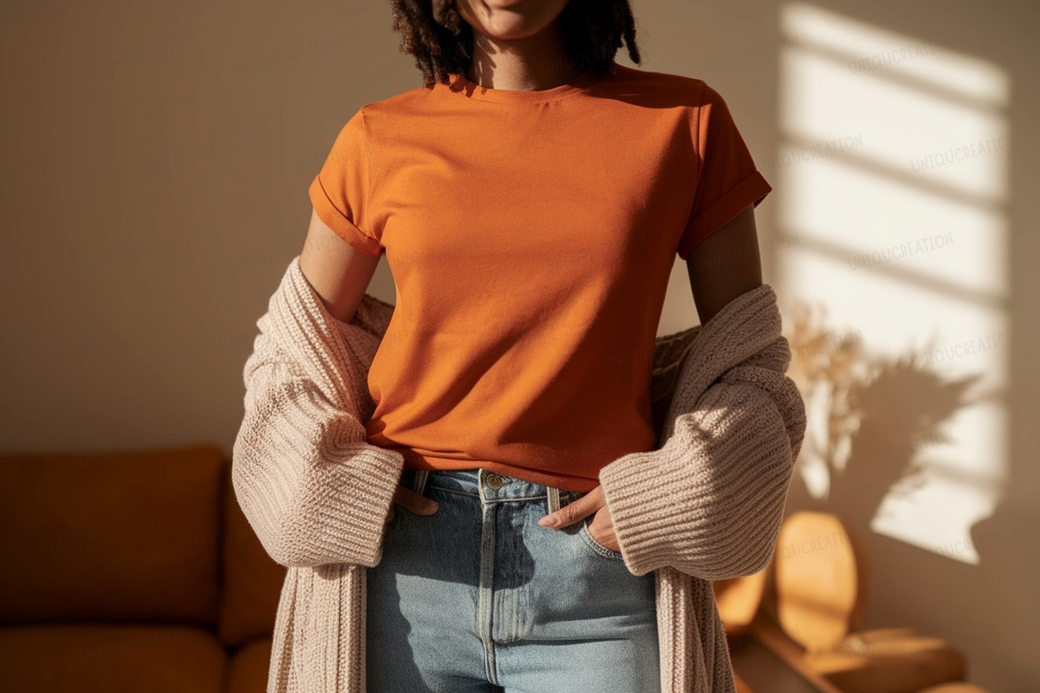 Fashion Shirt Clothing Casual Mockup Woman Orange Jeans Denim Cardigan