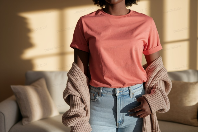Light Fashion Casual Woman Tee Jeans Coral Outfit Cozy Cardigan