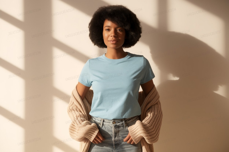 Similar Design Products to Woman wearing light blue t shirt and beige cardigan
