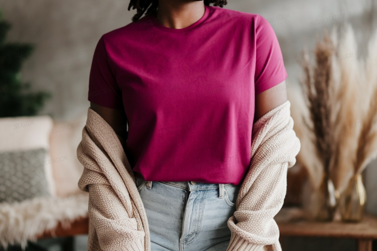 Similar Design Products to Woman wearing magenta t shirt and cardigan image