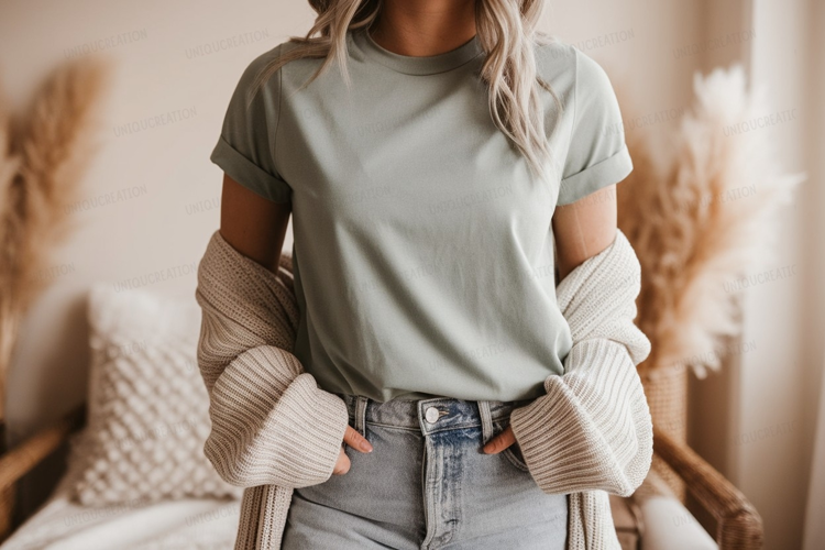Similar Design Products to Woman wearing green t shirt and beige cardigan image
