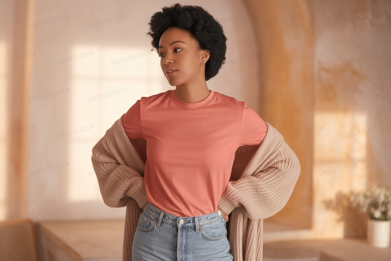 Similar Design Products to Woman wearing coral t shirt and cardigan