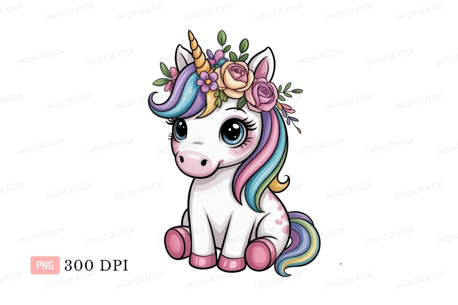 Cute unicorn with colorful mane and flowers fantasy example image 1