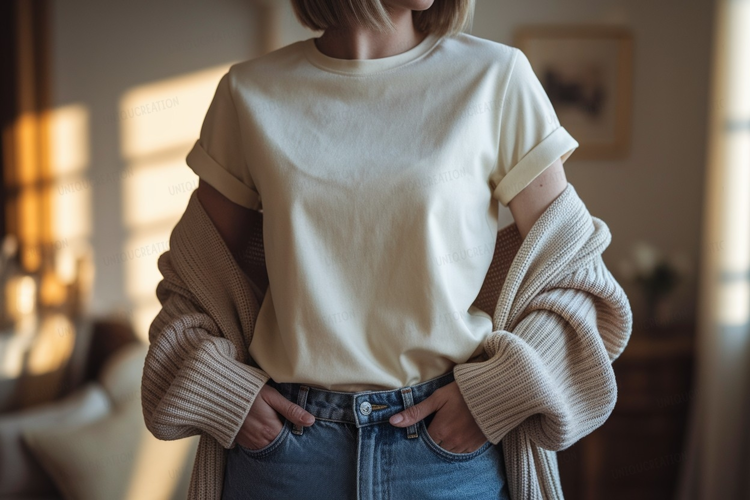 Fashion Shirt Clothing Casual Mockup Blue Jeans Person Cream Cardigan