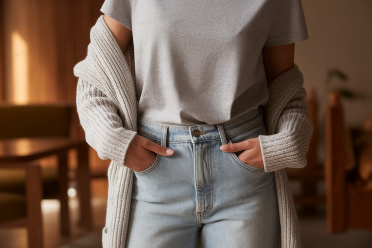 Casual grey t shirt light blue jeans and cardigan tshirt