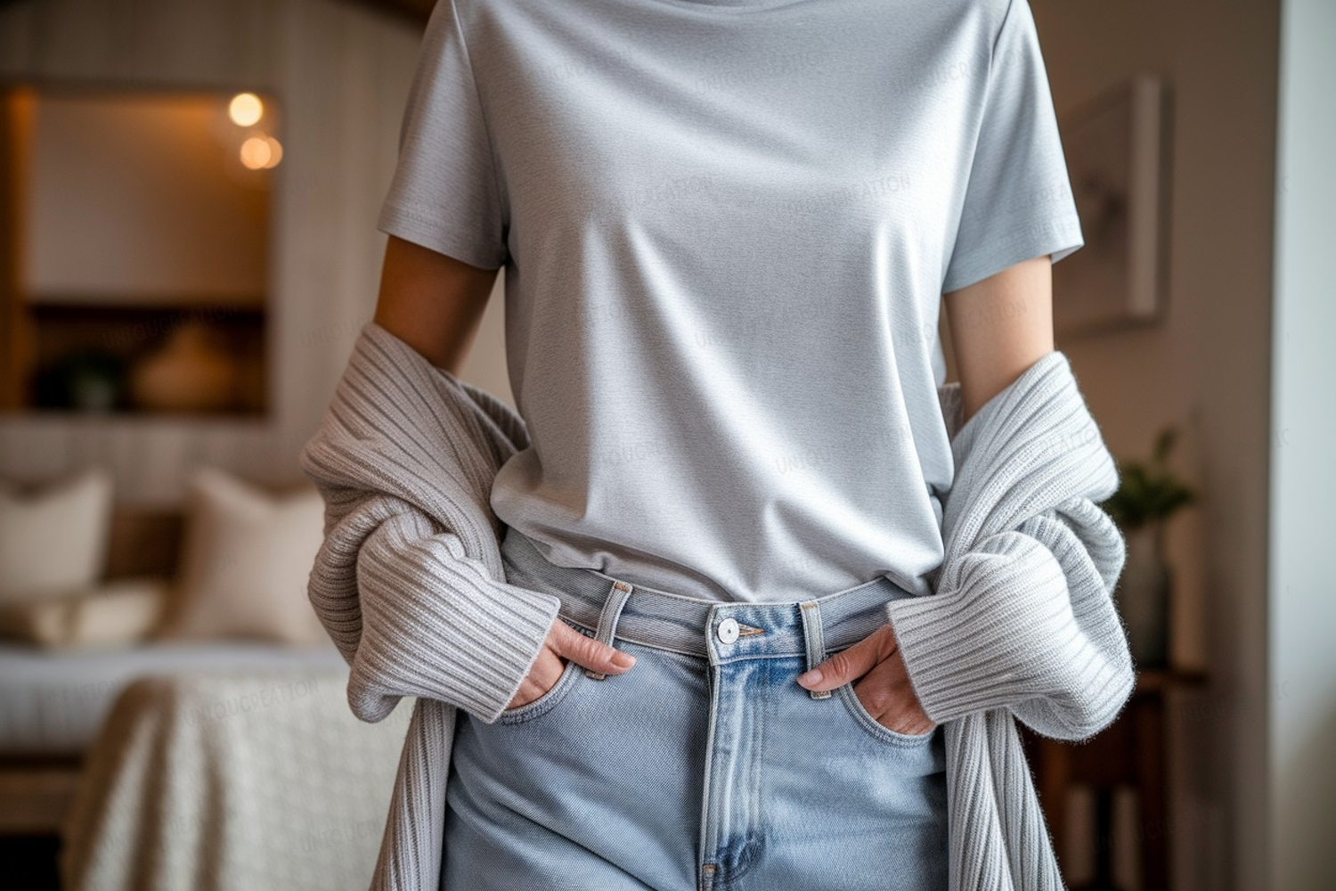 Similar Design Products to Woman wearing grey t shirt blue jeans and cardigan