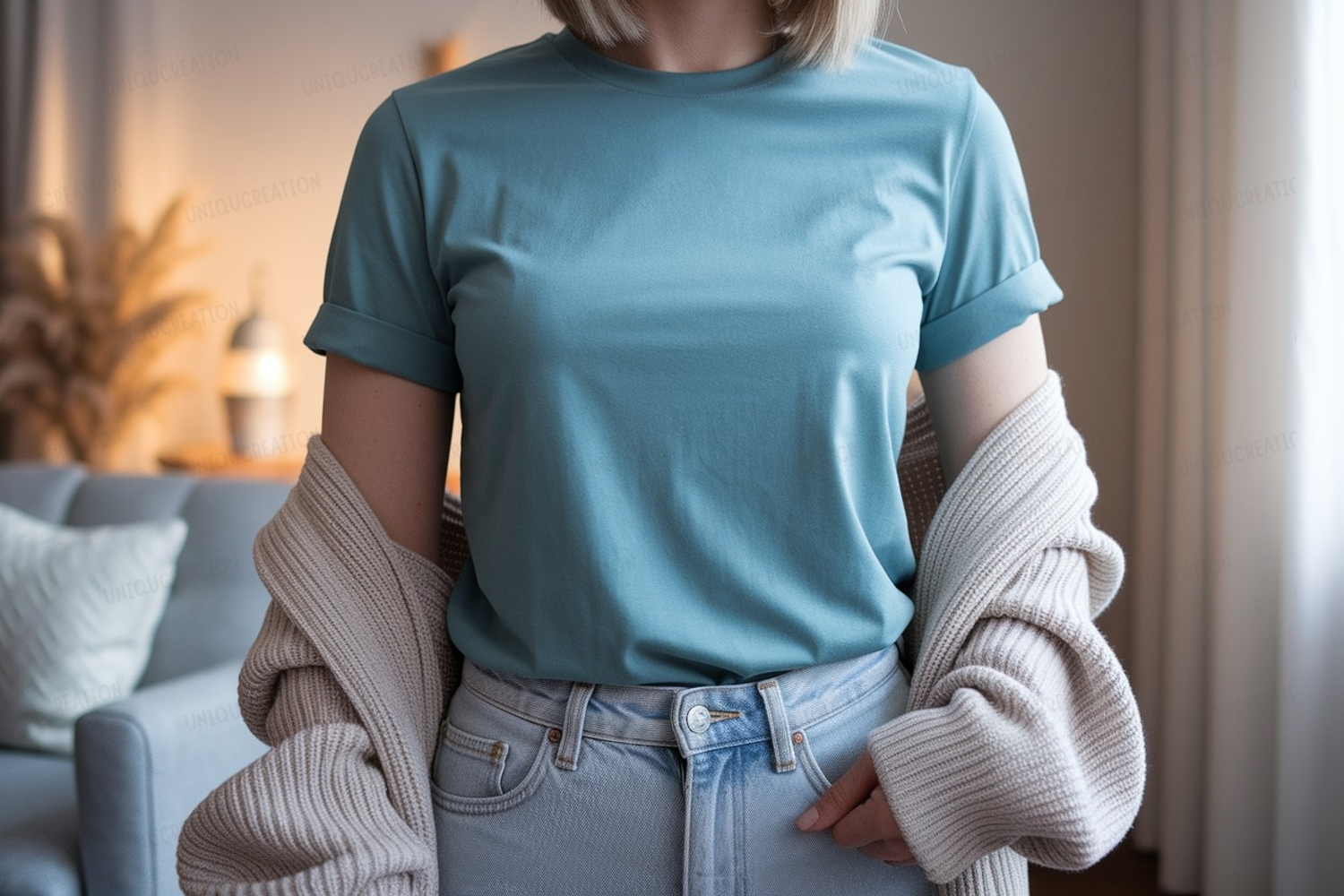 Teal t shirt light blue jeans beige cardigan tshirt example image 1