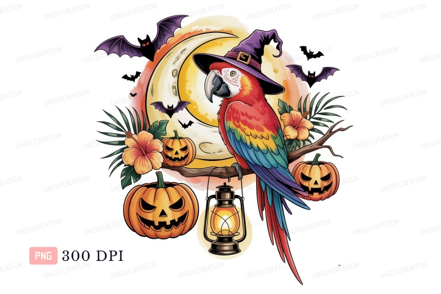 Similar Design Products to Colorful parrot witch with pumpkins and bats image