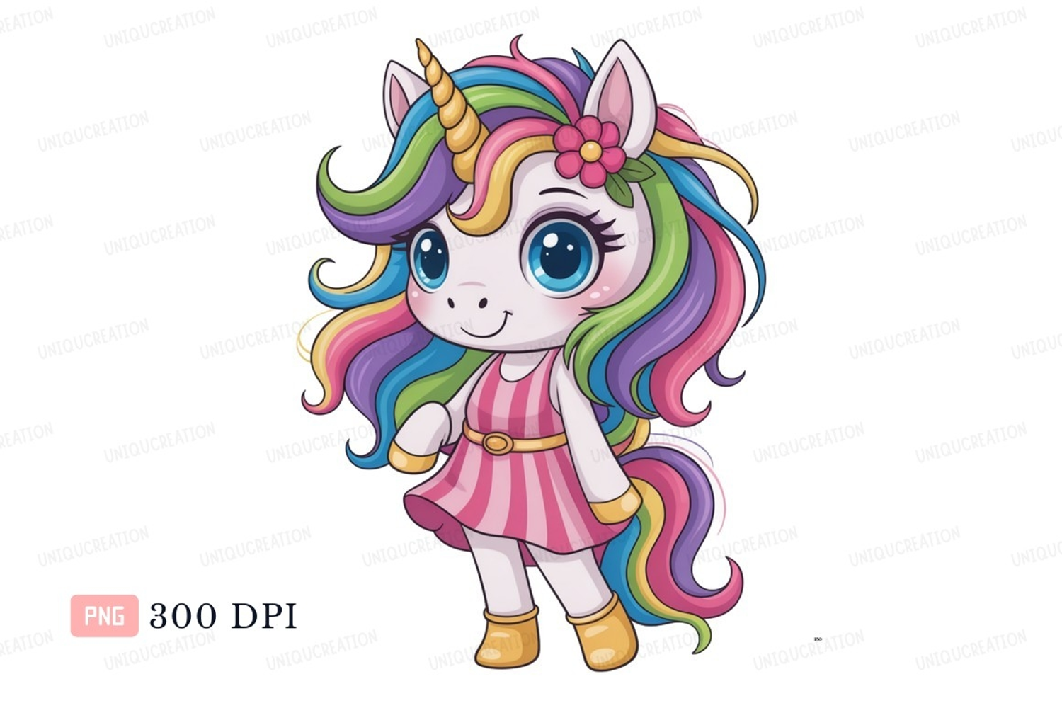 Cute unicorn with rainbow hair and pink dress image example image 1
