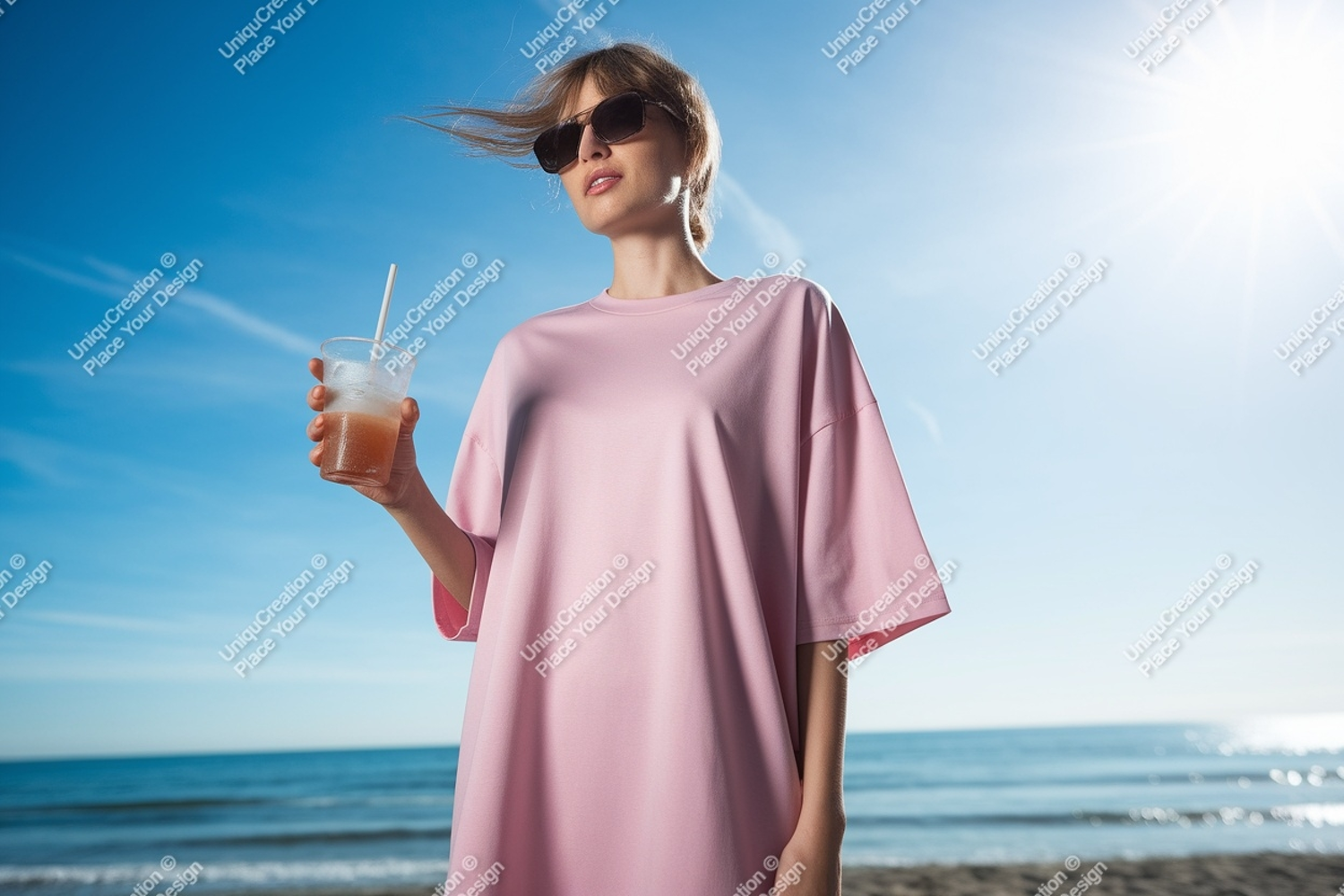 Fashion Summer Pink Ocean Woman Dress Beach Drink Sunglasses Sky
