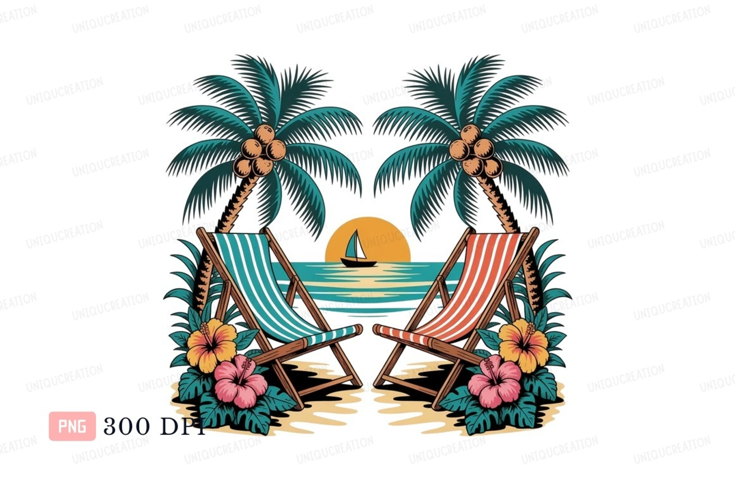 Tropical beach chairs sunset sailboat palm trees example image 1