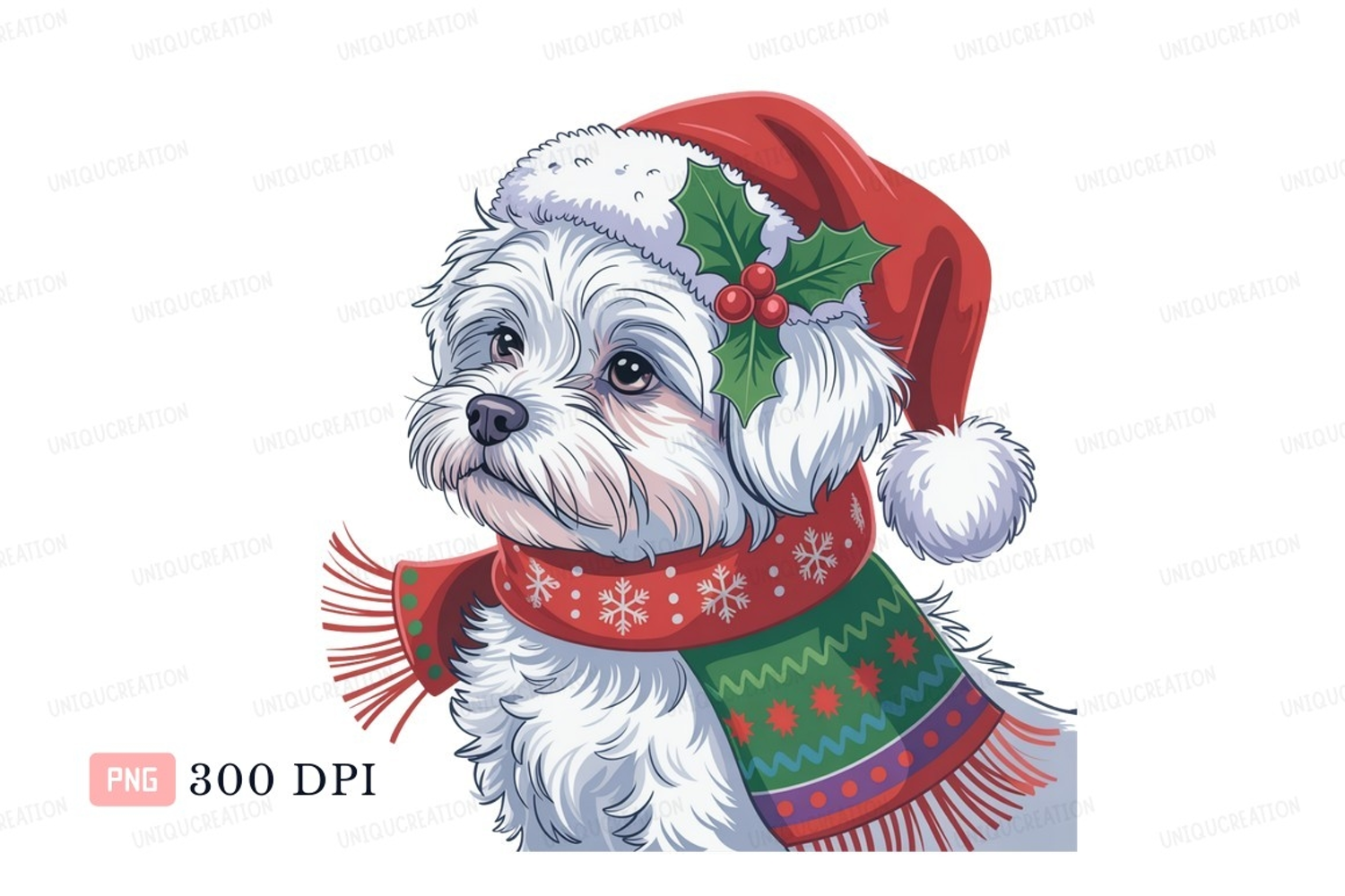 Similar Design Products to Fluffy white dog wearing christmas hat and scarf holly