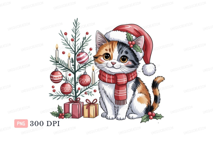 Festive calico cat wearing Santa hat and scarf kitten example image 1