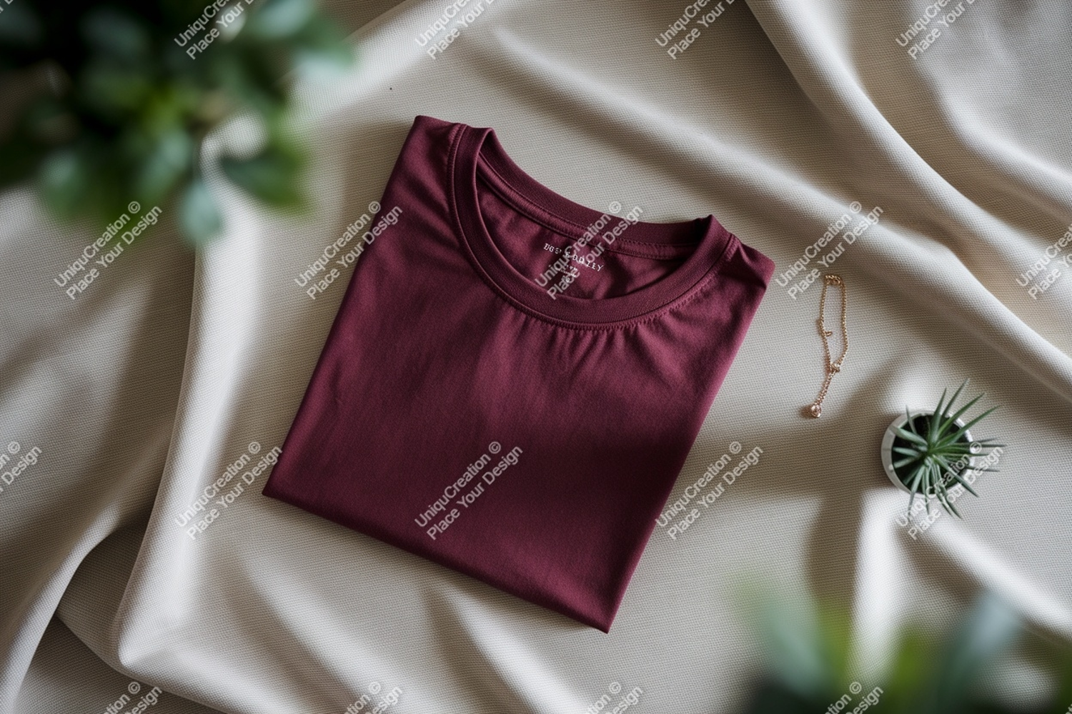 Maroon t shirt with gold necklace and plant mockup example image 1