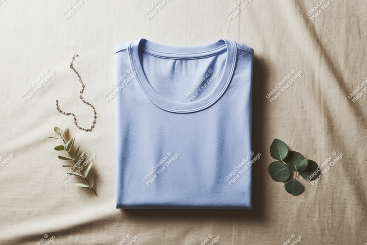 Similar Design Products to Folded blue t shirt with necklace and leaves mockup