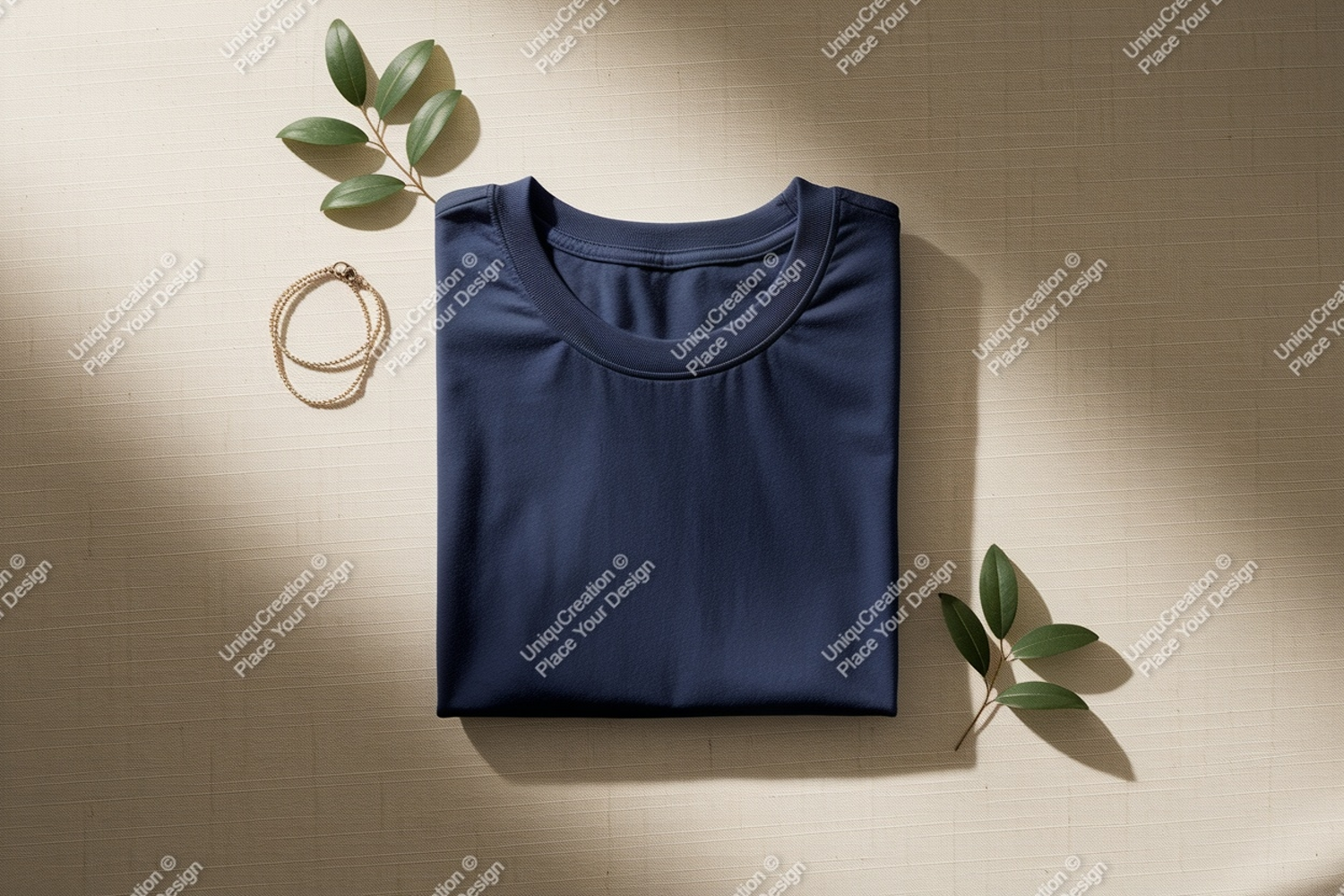 Similar Design Products to Folded dark blue t shirt with gold bracelet and green leaves