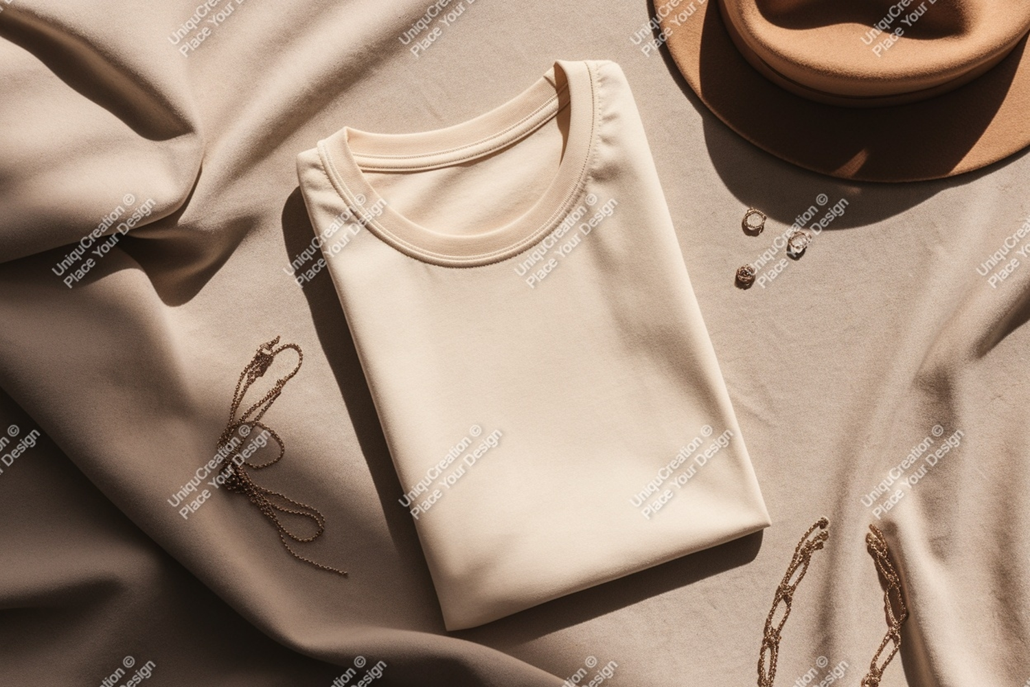 Gold Shirt Mockup Jewelry Fabric Hat Tan Cream Necklace Rings