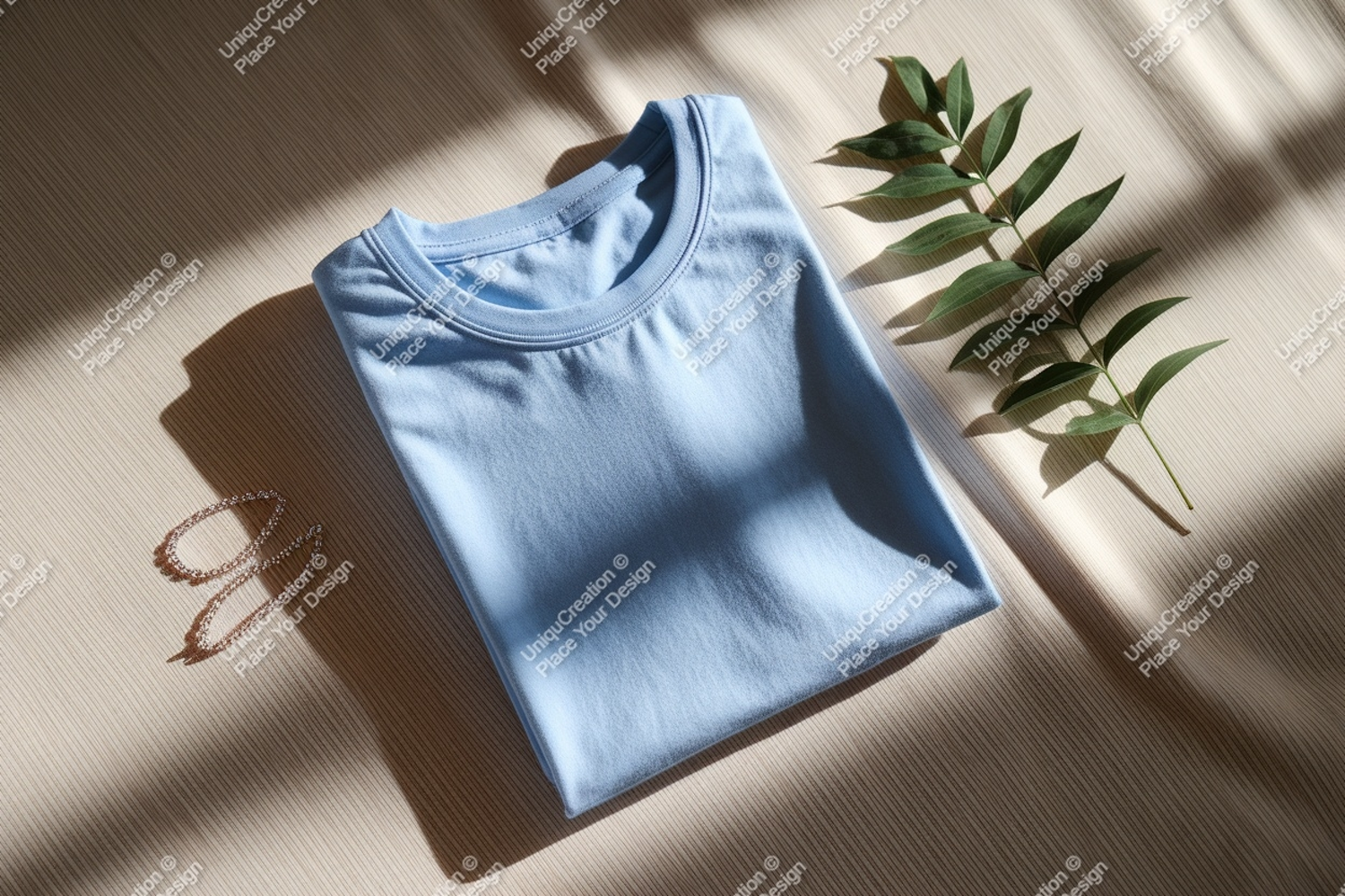 Blue t shirt with green leaf and jewelry mockup example image 1