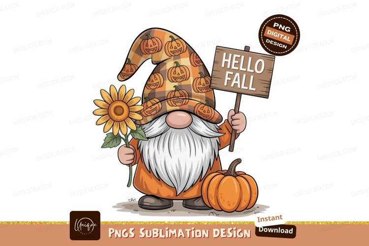 Gnome holding sunflower and pumpkin sign fall autumn example image 1