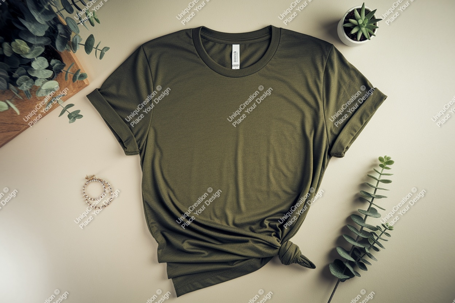 Similar Design Products to Olive green t shirt mockup with plants and jewelry