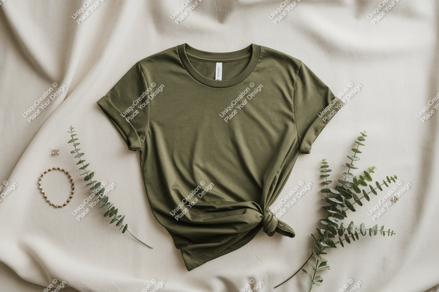 Similar Design Products to Olive green shirt mockup with jewelry and greenery