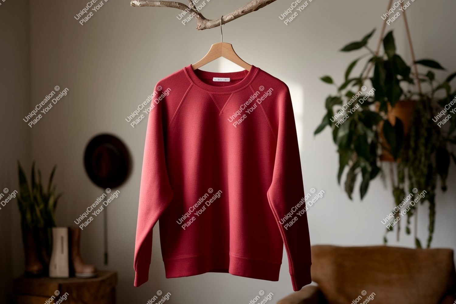 Clothing Mockup Apparel Red Hanging Garment Sweatshirt Raglan Sleeves Crewneck