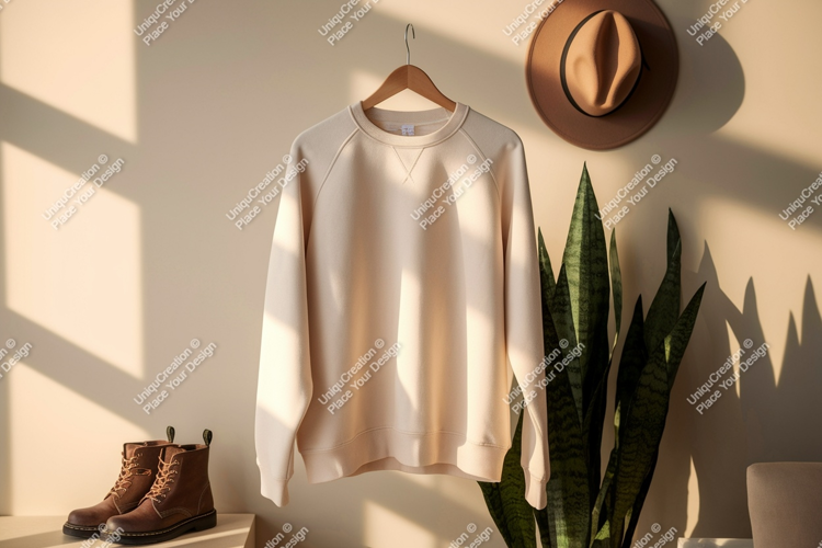 Cream sweatshirt hanging with hat boots and plant mockup example image 1