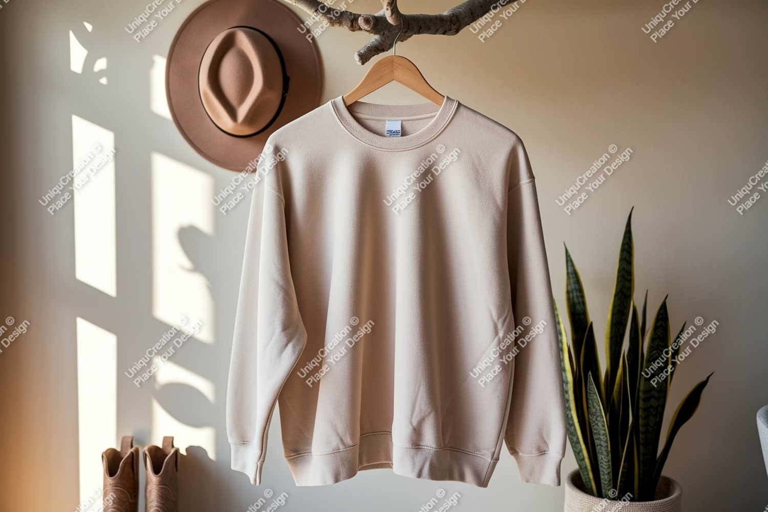 Beige crewneck sweatshirt hanging mockup example image 1
