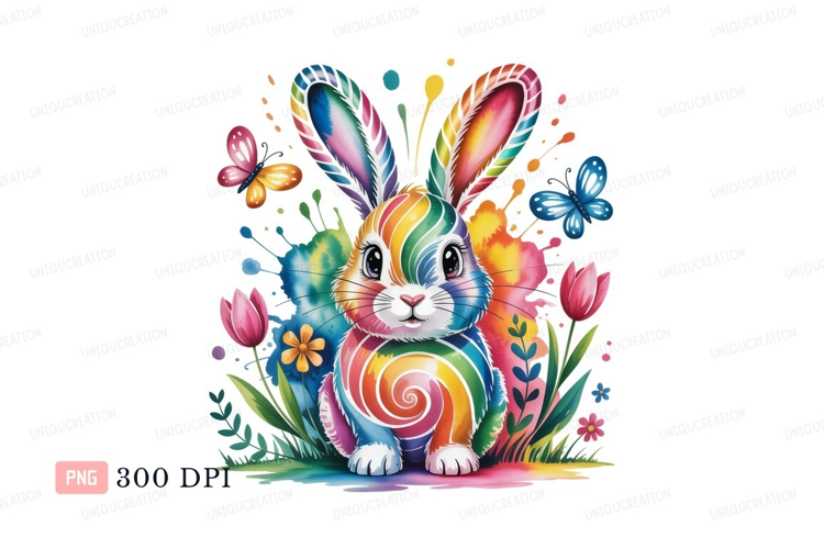Colorful bunny surrounded by flowers and butterflies example image 1