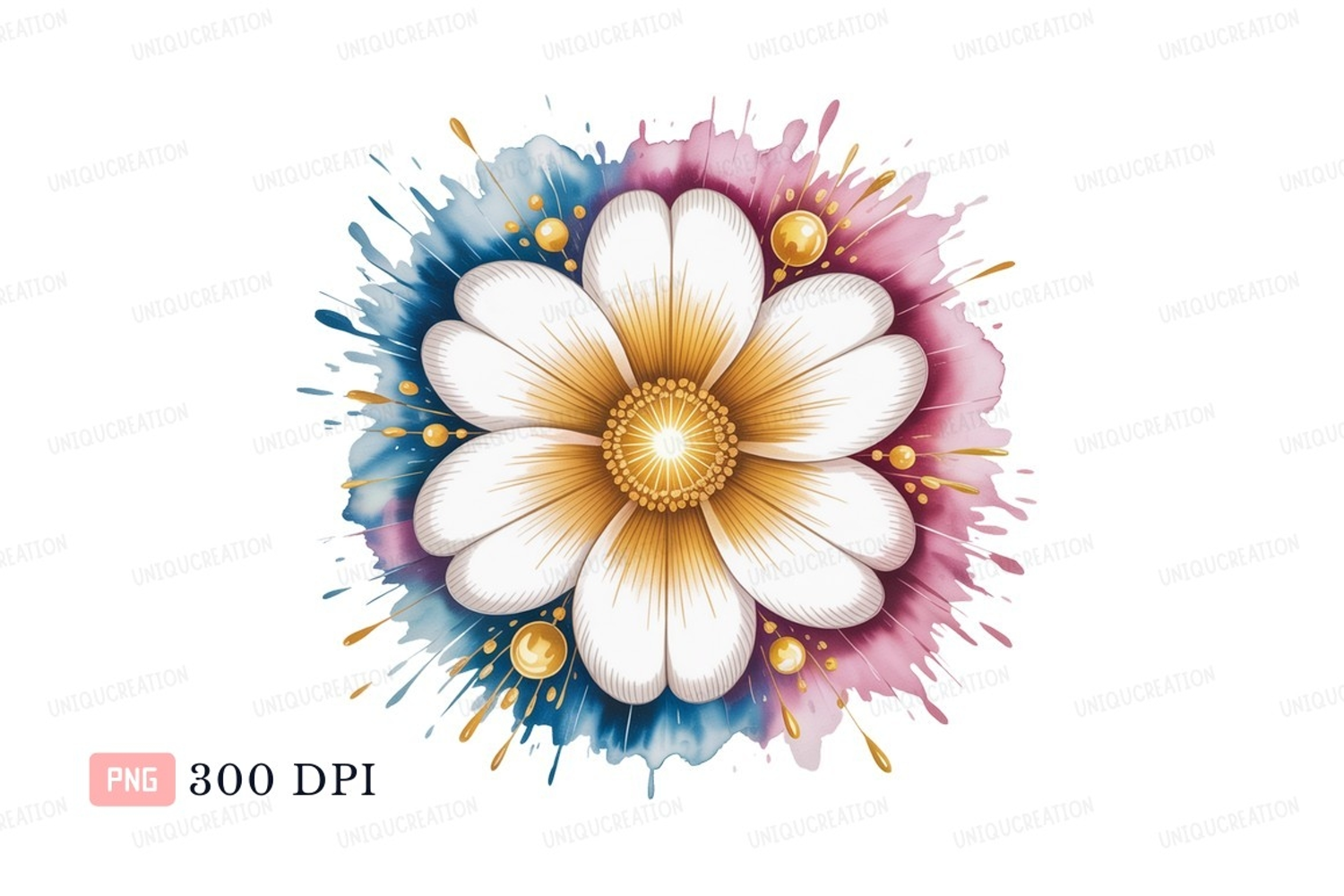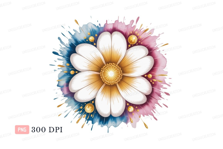 White flower gold center pink blue splash image example image 1