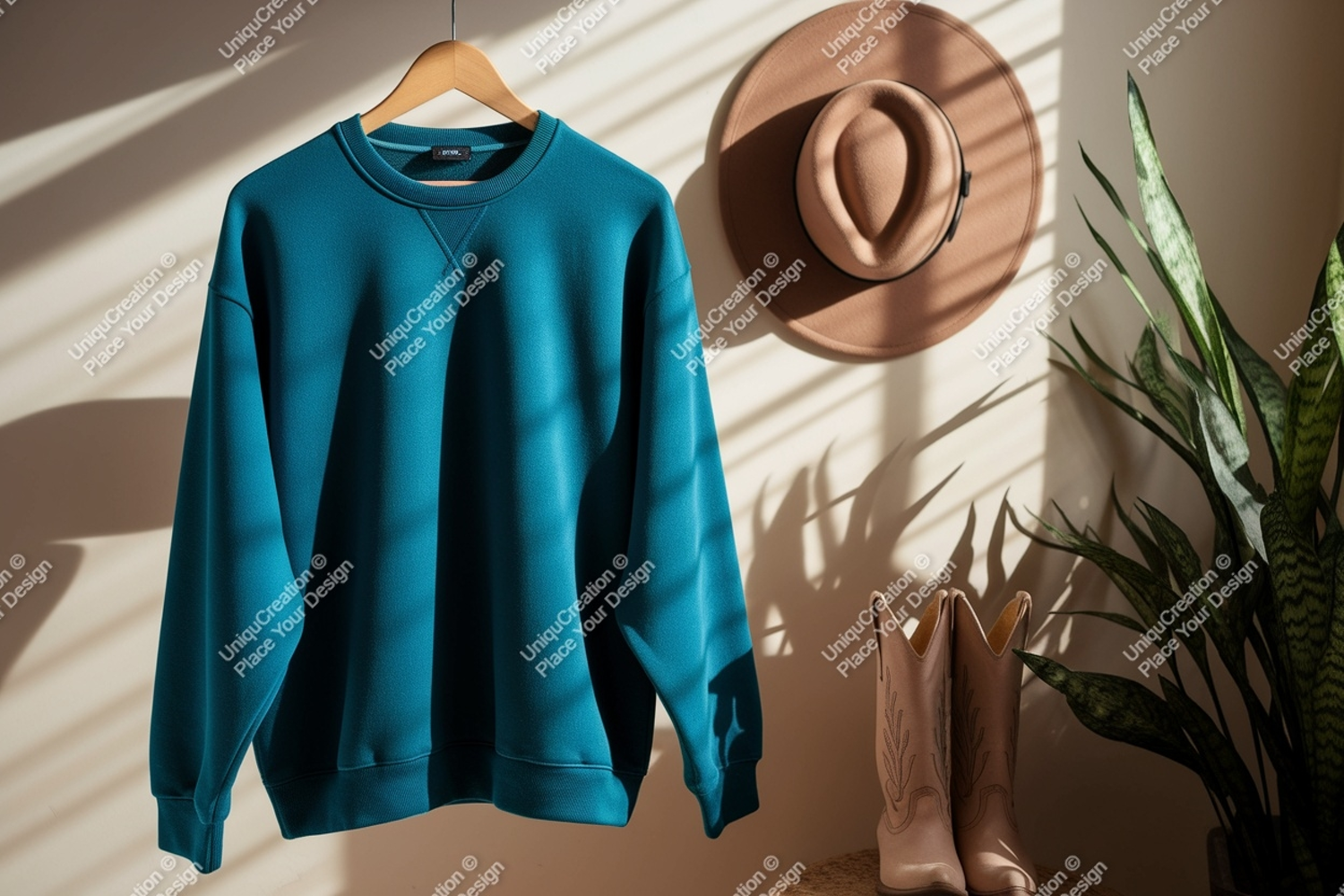 Similar Design Products to Teal sweatshirt tan hat cowboy boots plant image