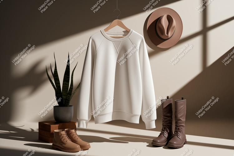 Similar Design Products to White sweatshirt tan hat brown boots plant mockup