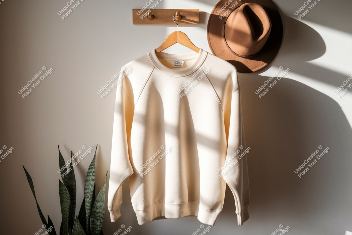 Similar Design Products to Creamy sweatshirt hanging on wall with hat image