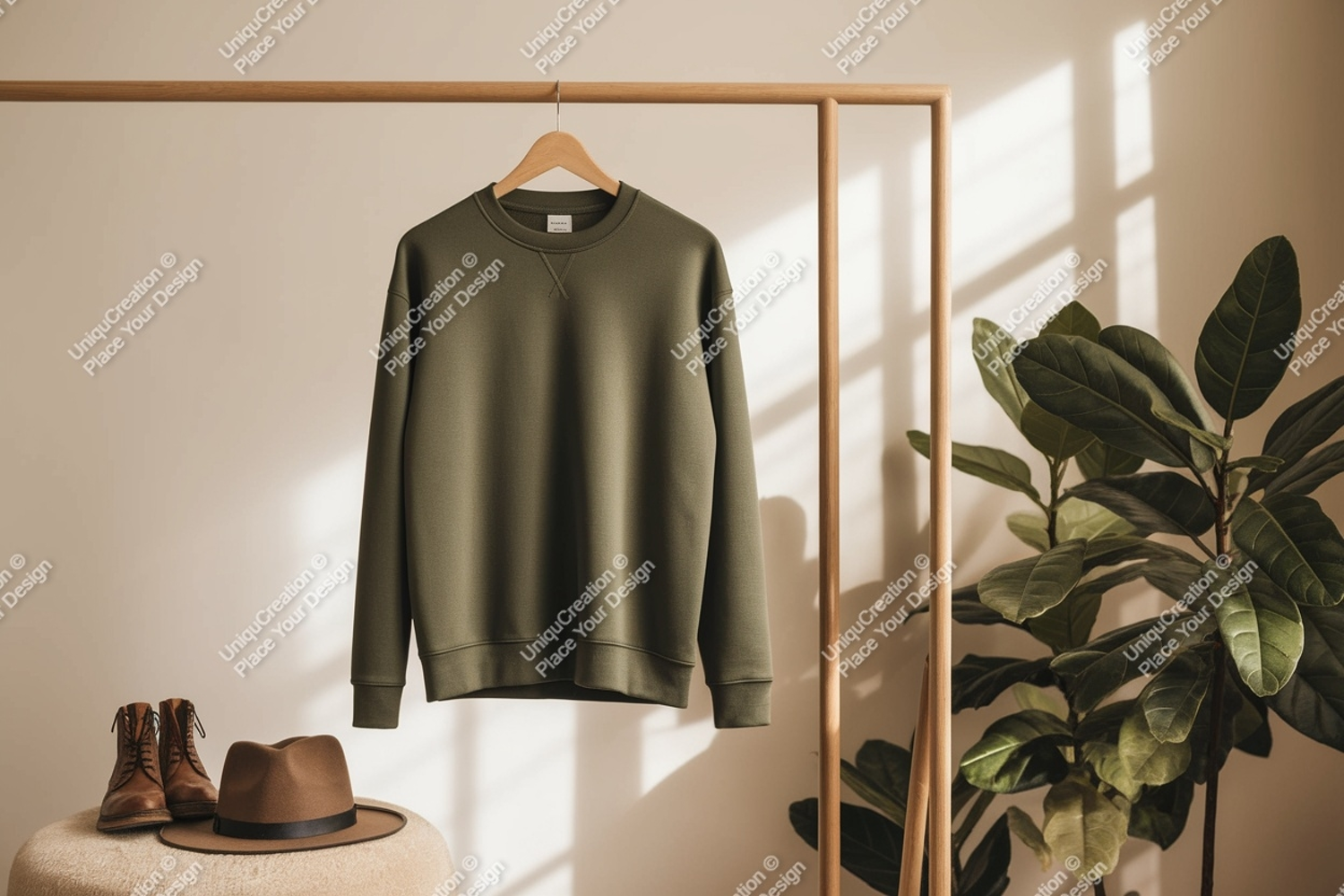 Similar Design Products to Olive green sweatshirt hanging on rack with boots and hat