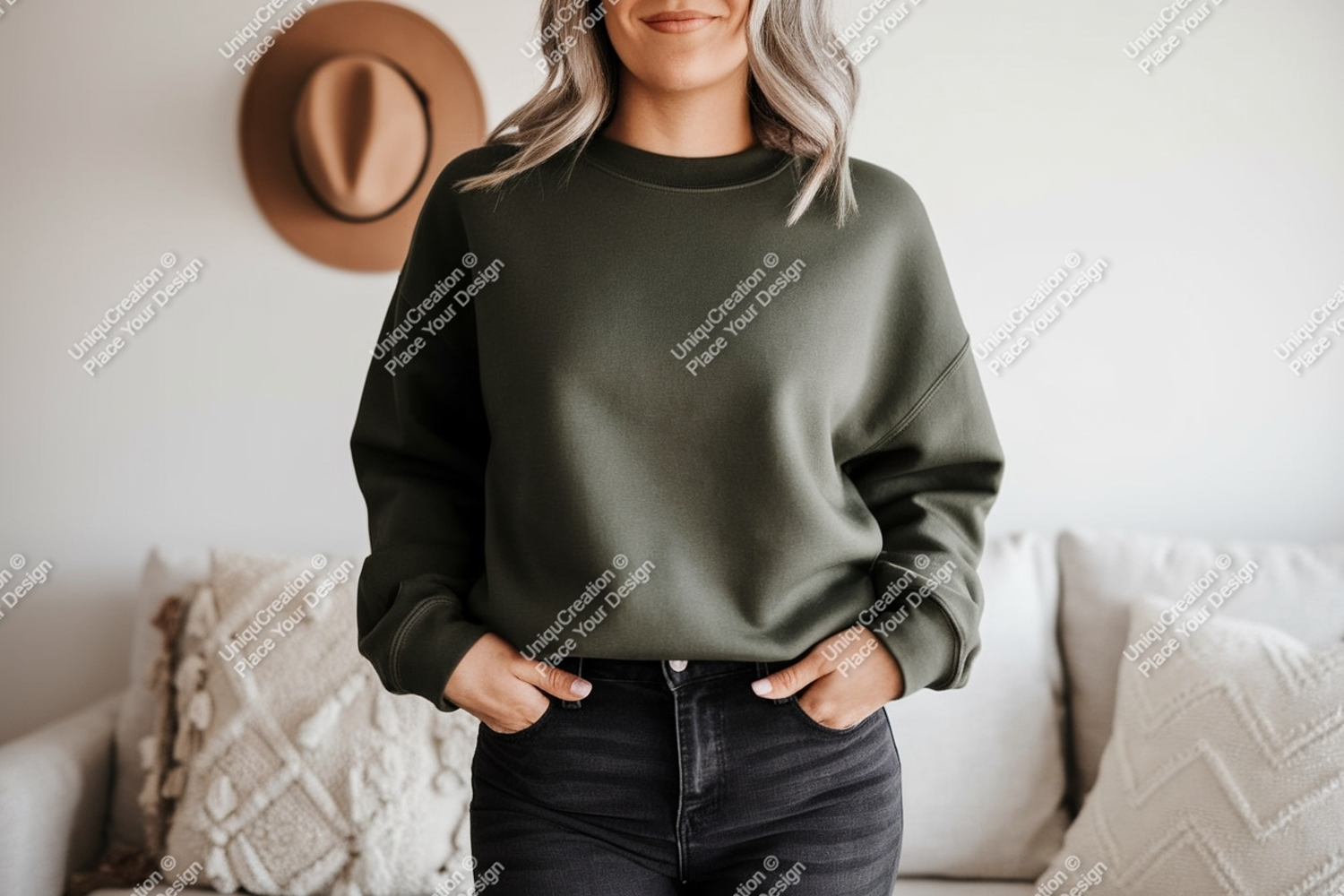 Fashion Clothing Casual Mockup Woman Dark Jeans Olive Denim Sweatshirt