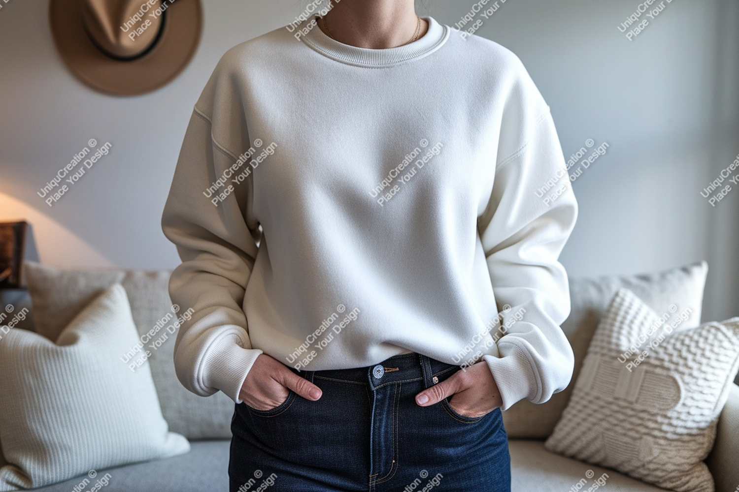 Fashion Clothing Casual Mockup Apparel Jeans Female Cream Denim Sweatshirt
