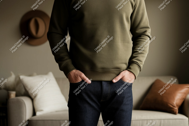 Man Casual Hands Dark Pillow Olive Denim Couch Sweatshirt Pockets