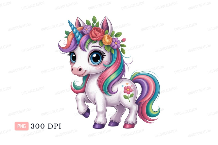Cute unicorn with colorful mane and floral crown fantasy example image 1
